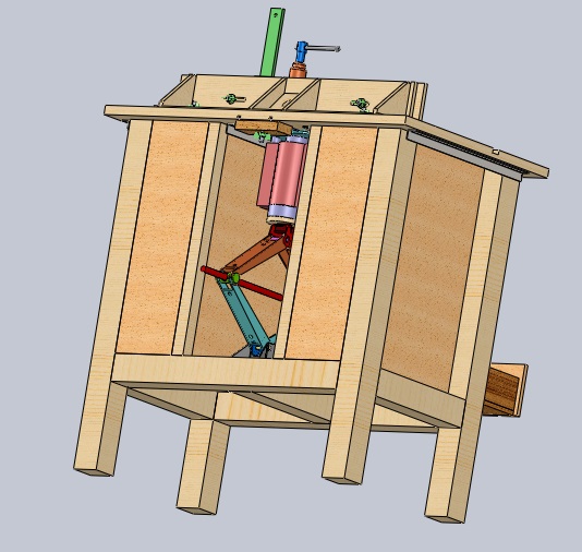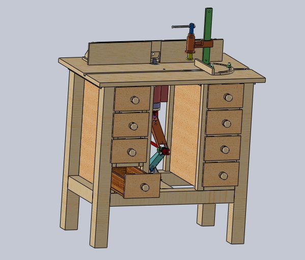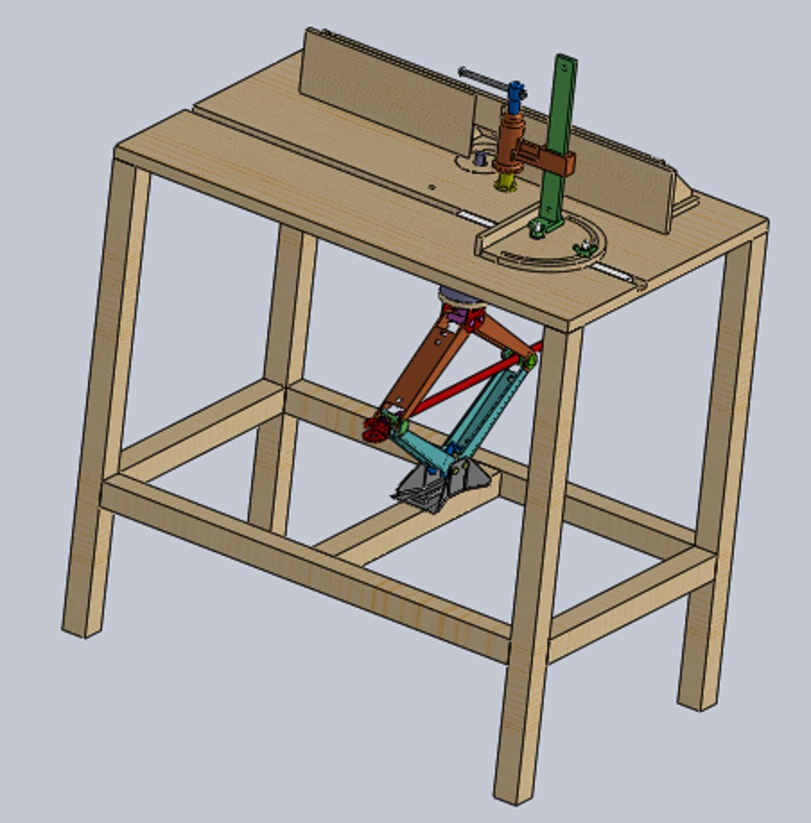 Je vais certainement utiliser le système de vis en biais. Par contre, je vais changer mon système de piètement car je voudrais que mon plateau soit basculant pour monter plus facilement la défonceuse.