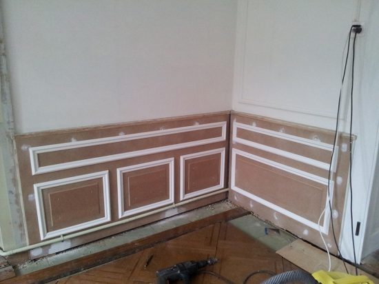 Si tes murs de sous-bassement sont plâtrés et en très bon état, bien plans, tu peux, si tu le souhaite te dispenser de poser les panneaux de fond en CP et poser les moulures et panneaux de relief bois directememt sur le plâtre par collage.