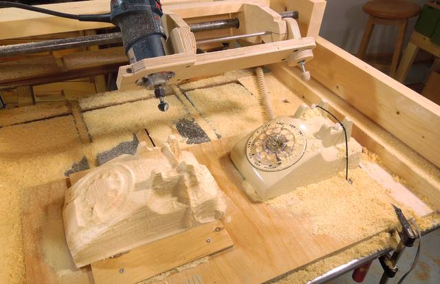 [*]Un 3D router pentograph: http://woodgears.ca/pantograph/index.html [*]Un router copy carver: http://woodgears.ca/copy_carver/index.html [*]Le celebre pantorouter: http://woodgears.ca/pantorouter/index.htmlSauf que c'est uniquement manuel. Cela peut être une base de travail.