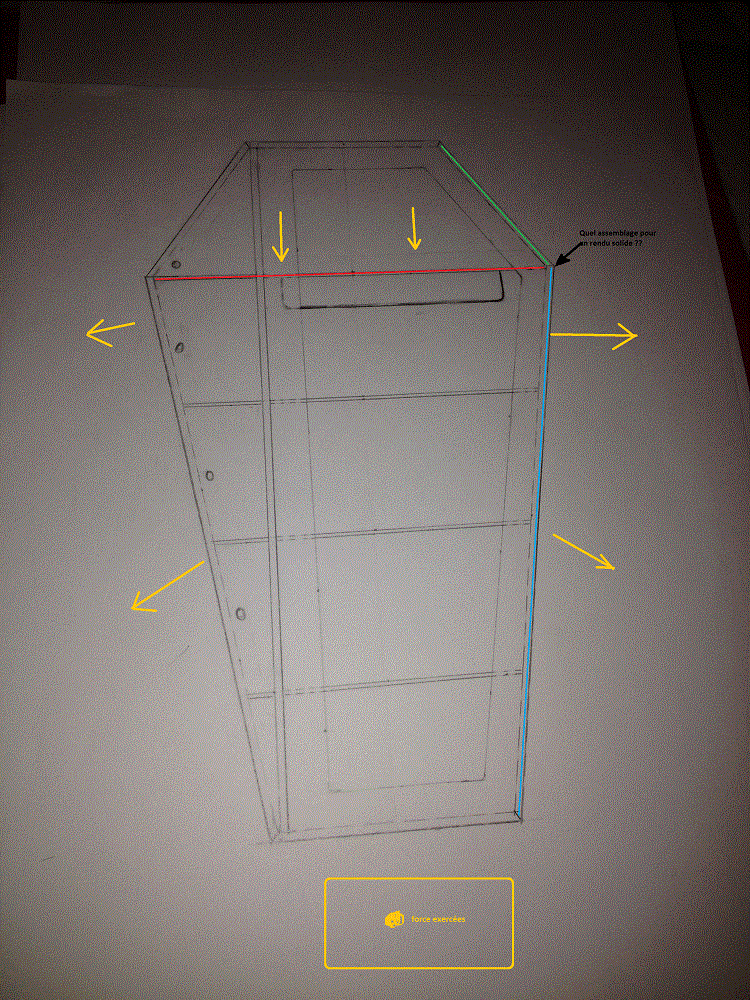 j'ai fais un rapide plan et me suis rendu compte que je me demandai quel assemblages vais-je pouvoir faire entre telle et telle partie ( ci joint un dessin fléché pour m'expliquer ) en sachant qu'il risque d'y avoir du poids sur les différentes étagères et que cela doit bien tenir car usage quotidien du meuble .